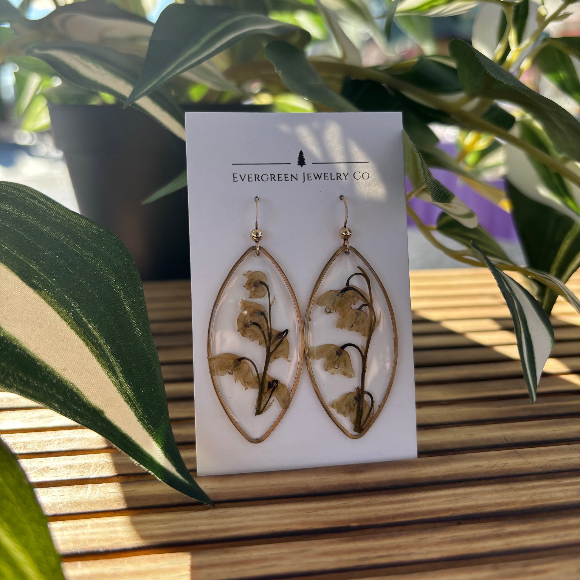 Crafted with pressed lily of the valley flowers, encased in clear resin and set in a brass bezel. Made with hypoallergenic 14k gold fill ear wires.