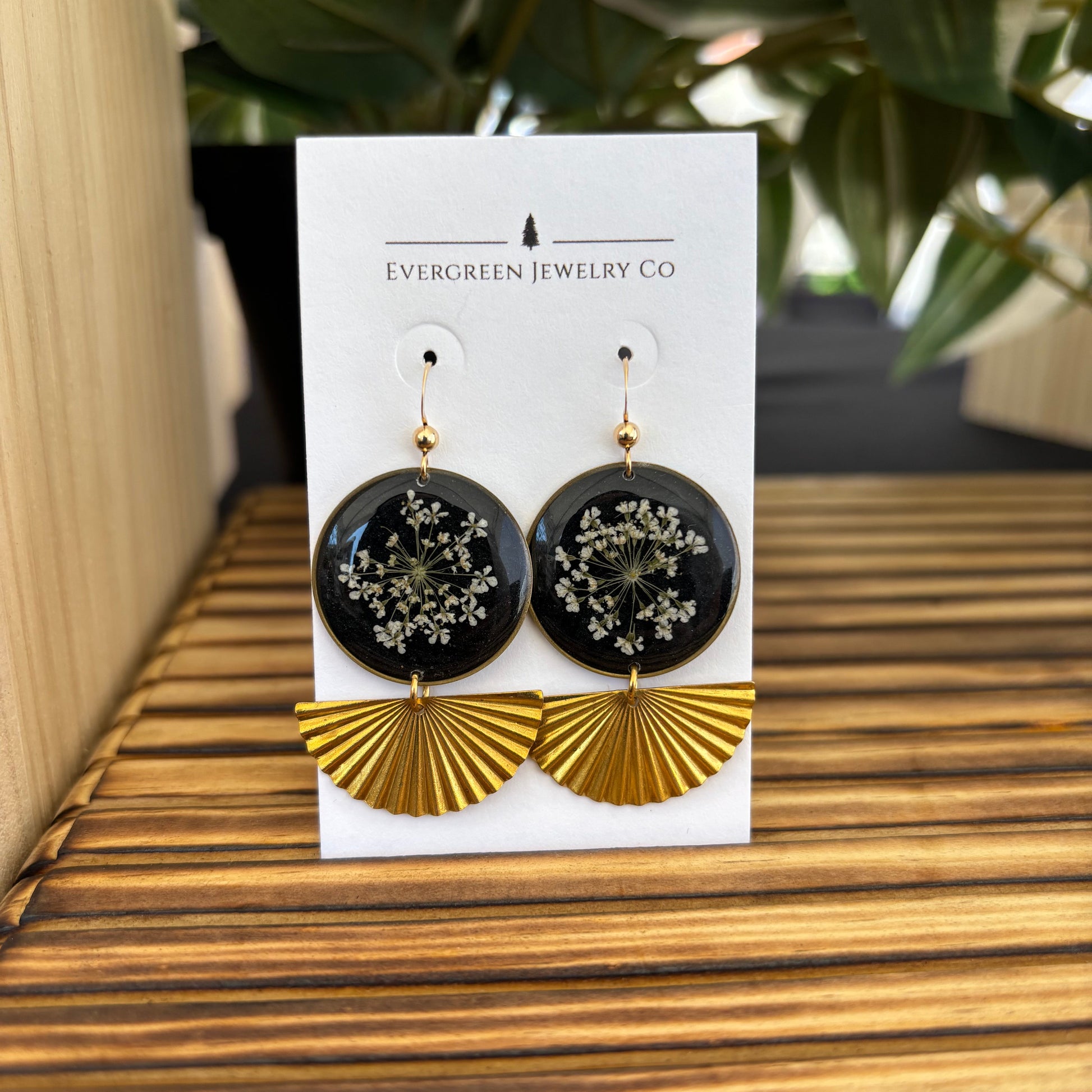 Crafted with pressed Queen Anne's lace flowers, encased in resin and set in a brass bezel. Made with hypoallergenic 14k gold fill ear wires.