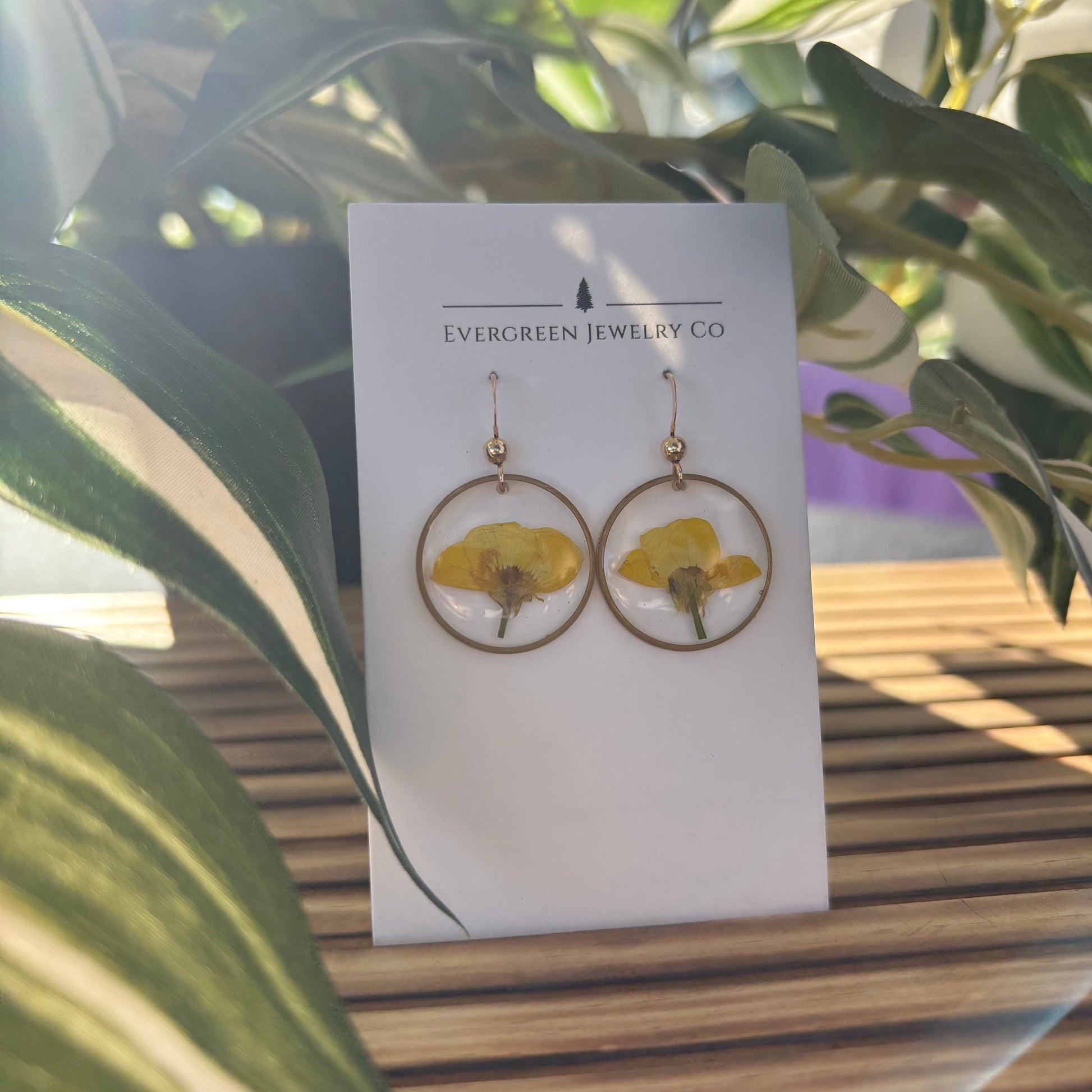 Crafted with pressed buttercups, encased in clear resin and set in a brass bezel. Made with hypoallergenic 14k gold fill ear wires.