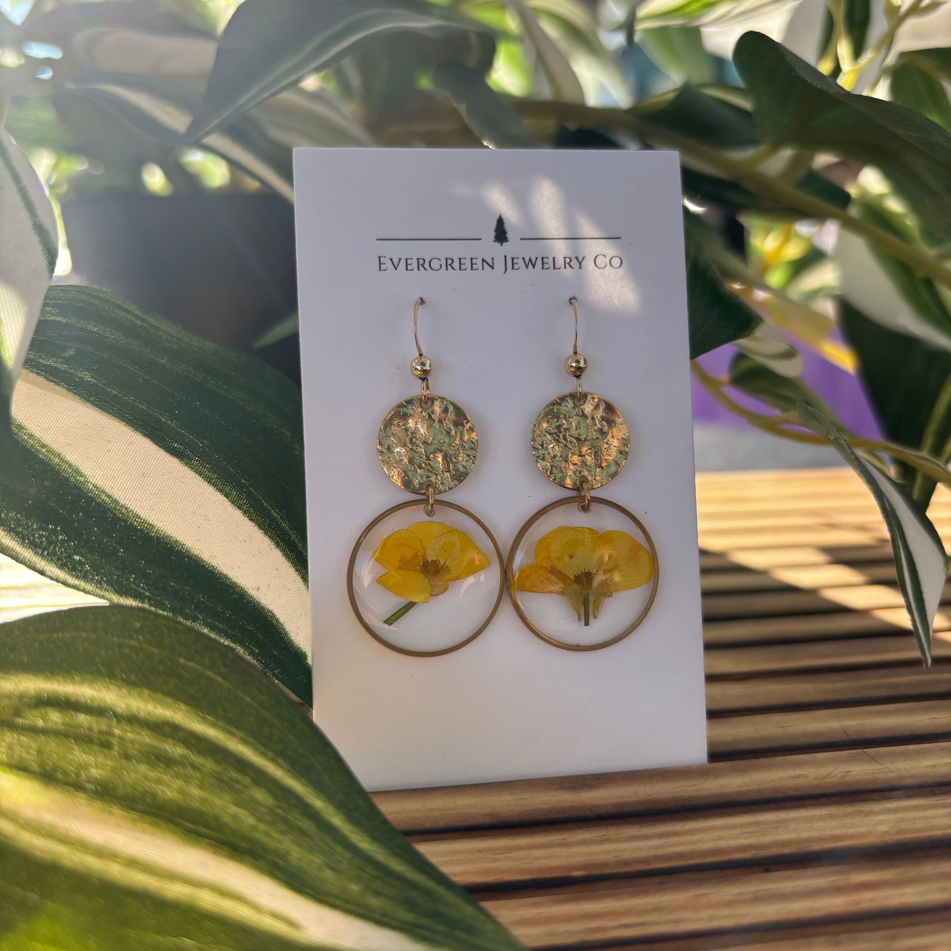 Crafted with pressed buttercups, encased in clear resin and set in a brass bezel, hanging from a hammered brass coin. Made with hypoallergenic 14k gold fill ear wires.