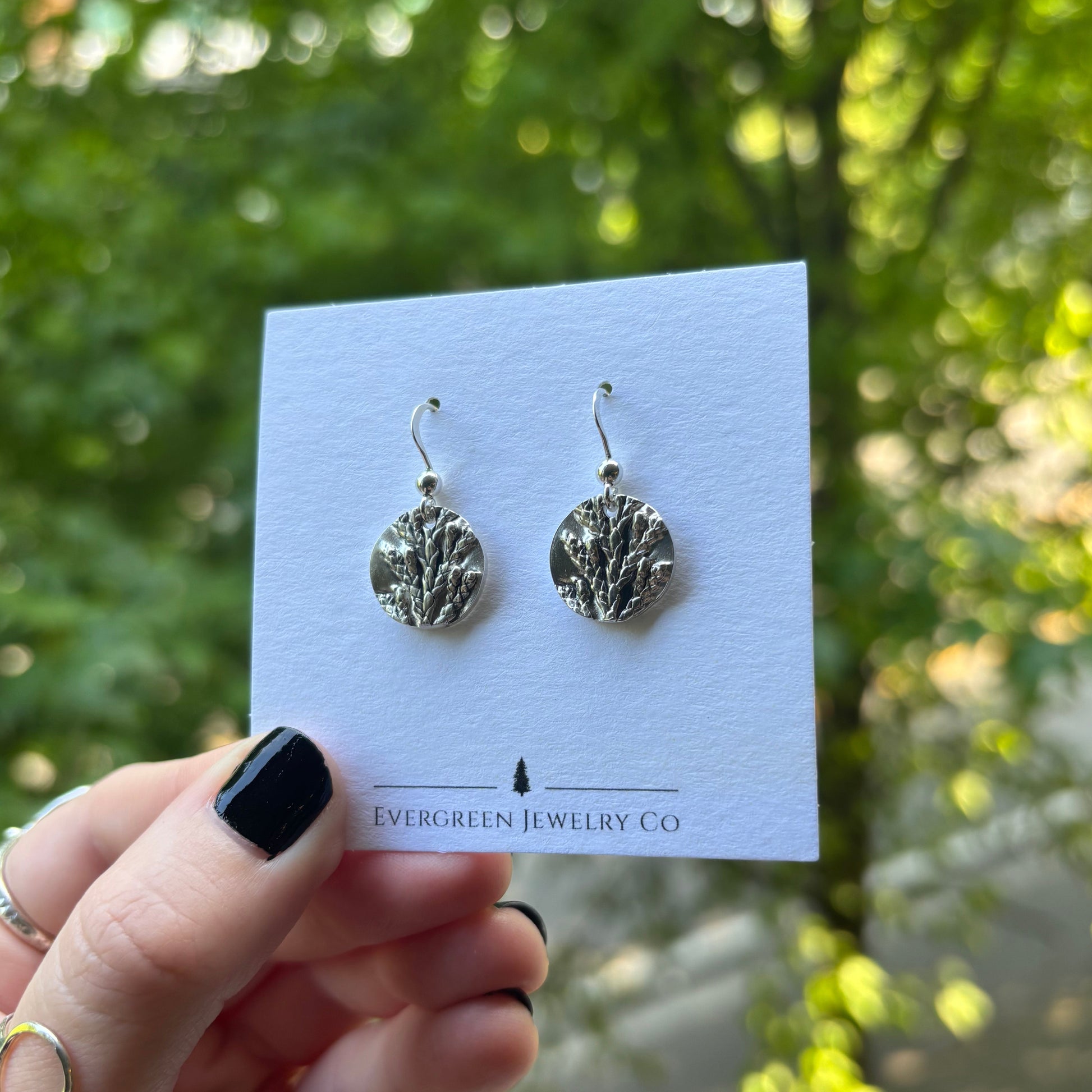 These handmade fine silver earrings are made from Art Clay Silver and a real piece of cedar. Once kiln fired, the silver clay transforms into 99.9% pure silver, and is then blackened and polished by hand.