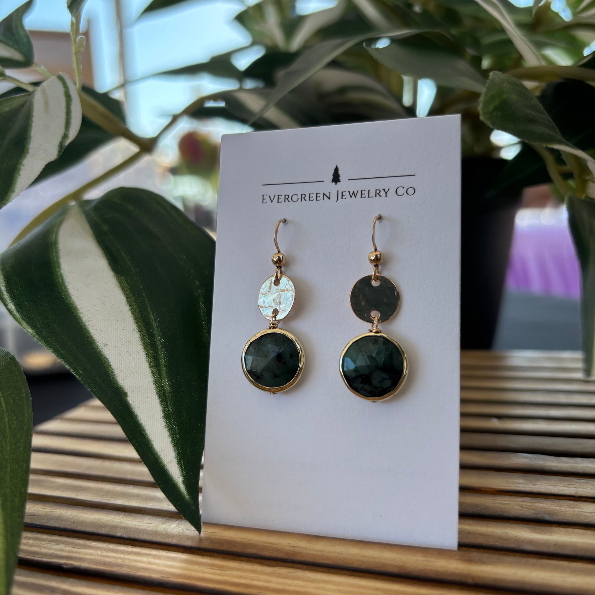 Emeralds in gold plated sterling silver bezels. Ear wires and hammered coin are 14k gold fill.