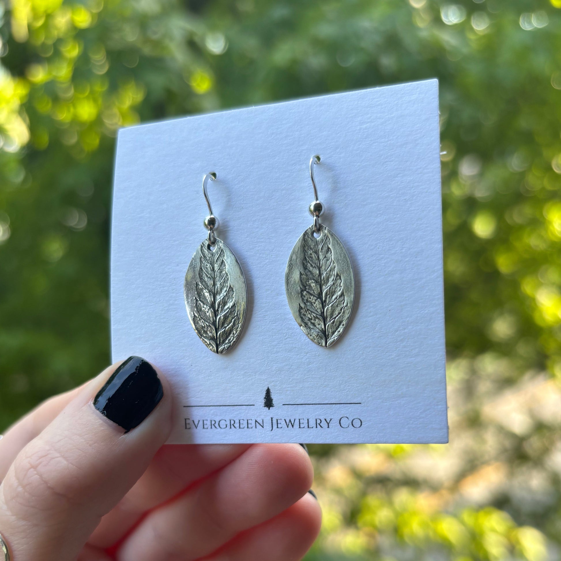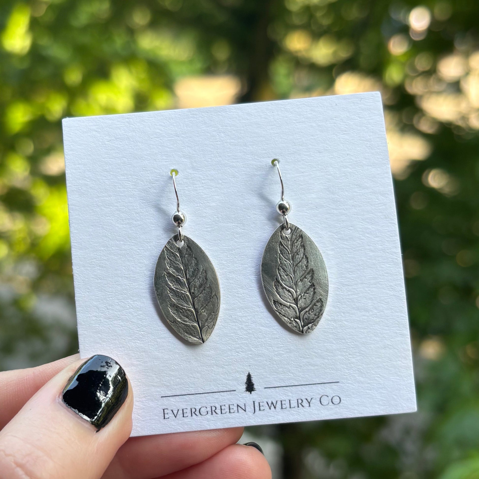 These handmade fine silver earrings are made from Art Clay Silver and a real fern leaf. Once kiln fired, the silver clay transforms into 99.9% pure silver, and is then blackened and polished by hand.
