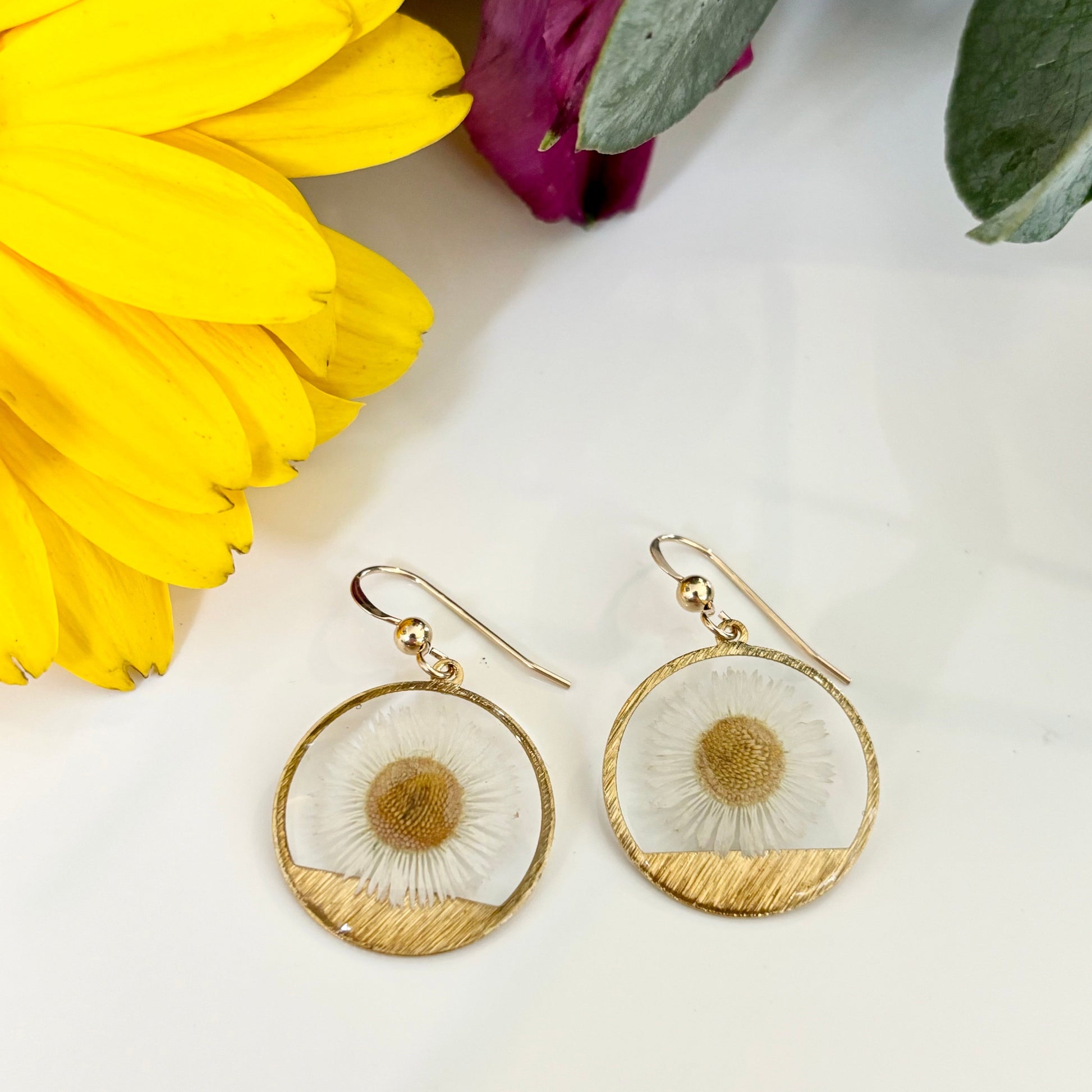 Crafted with pressed fleabane flowers, encased in a clear resin, and set in a brass bezel. Made with hypoallergenic 14k gold fill ear wires.