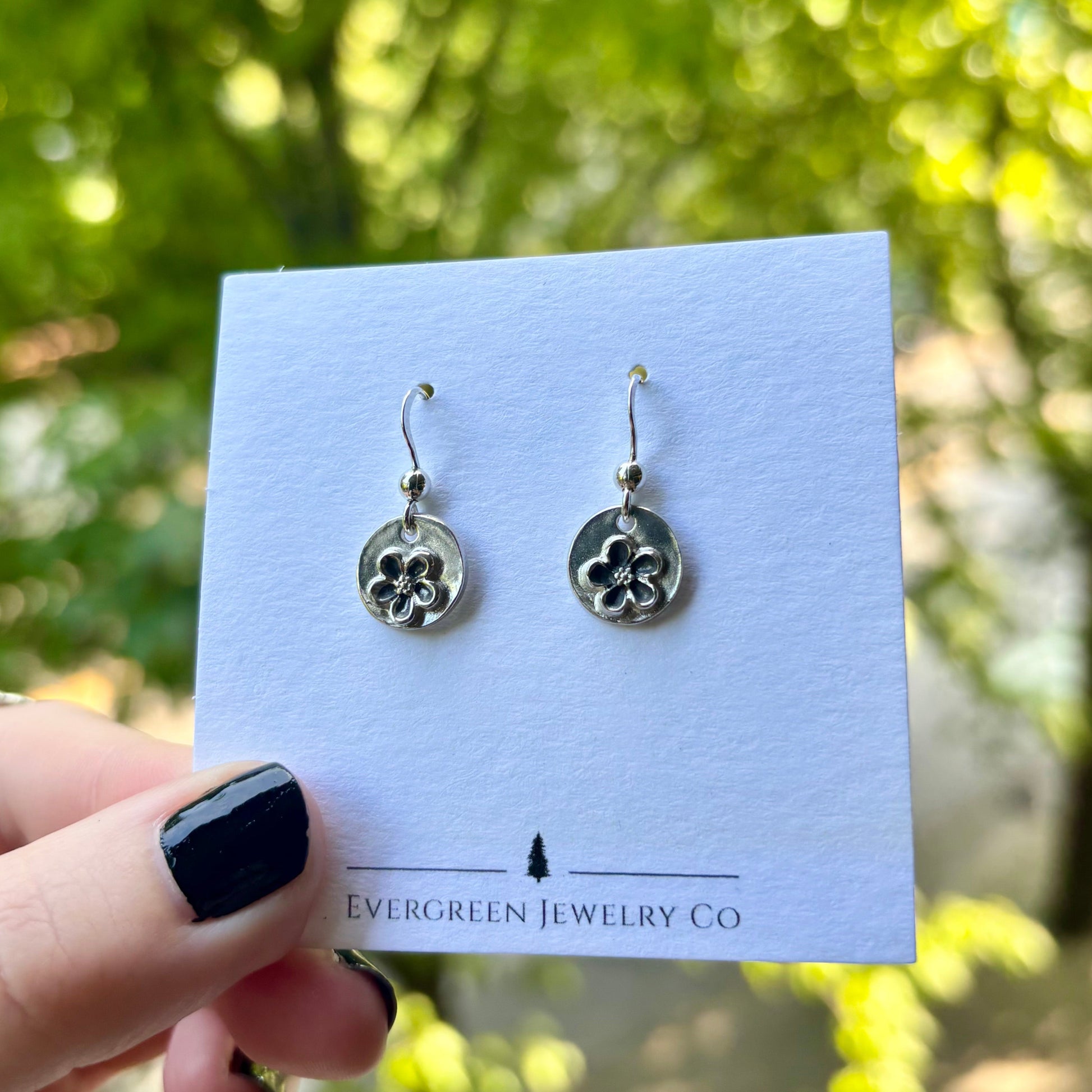 These handmade fine silver earrings feature forget-me-not flowers made from Art Clay Silver. Once kiln fired, the silver clay transforms into 99.9% pure silver, and is then blackened and polished by hand.