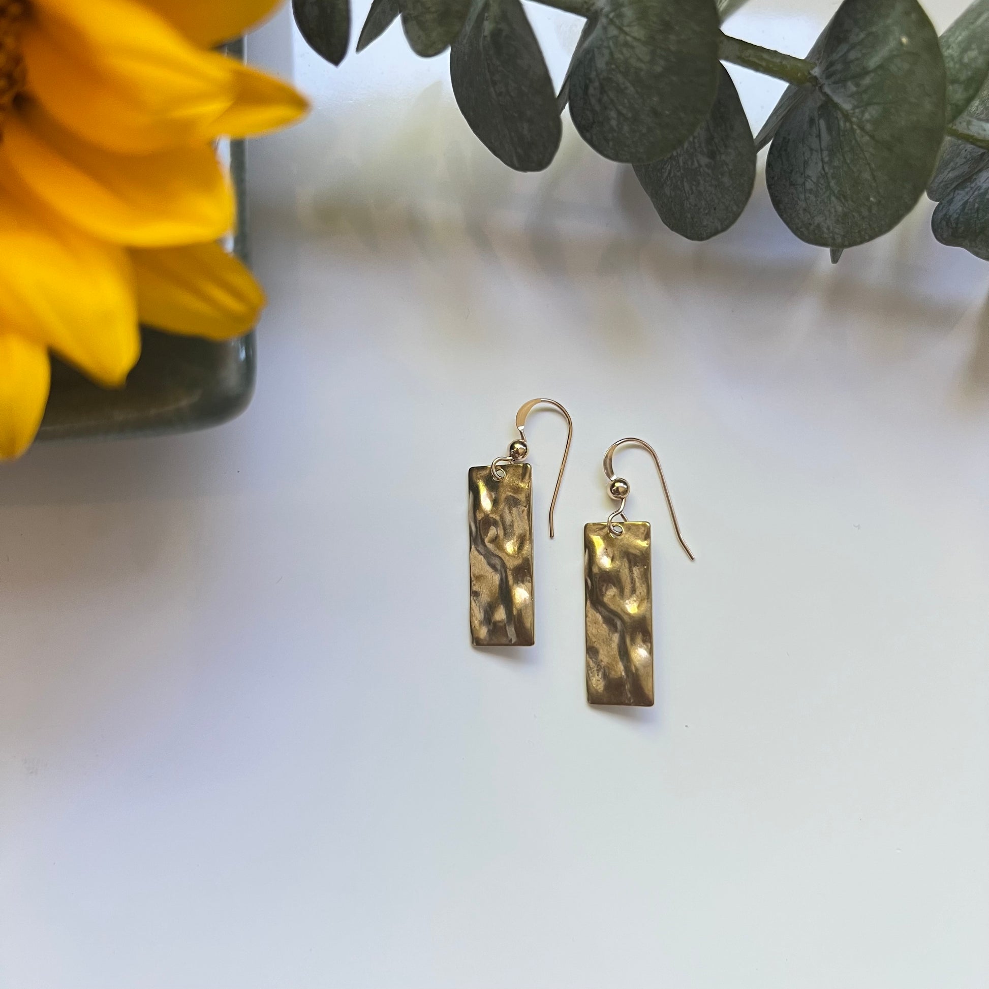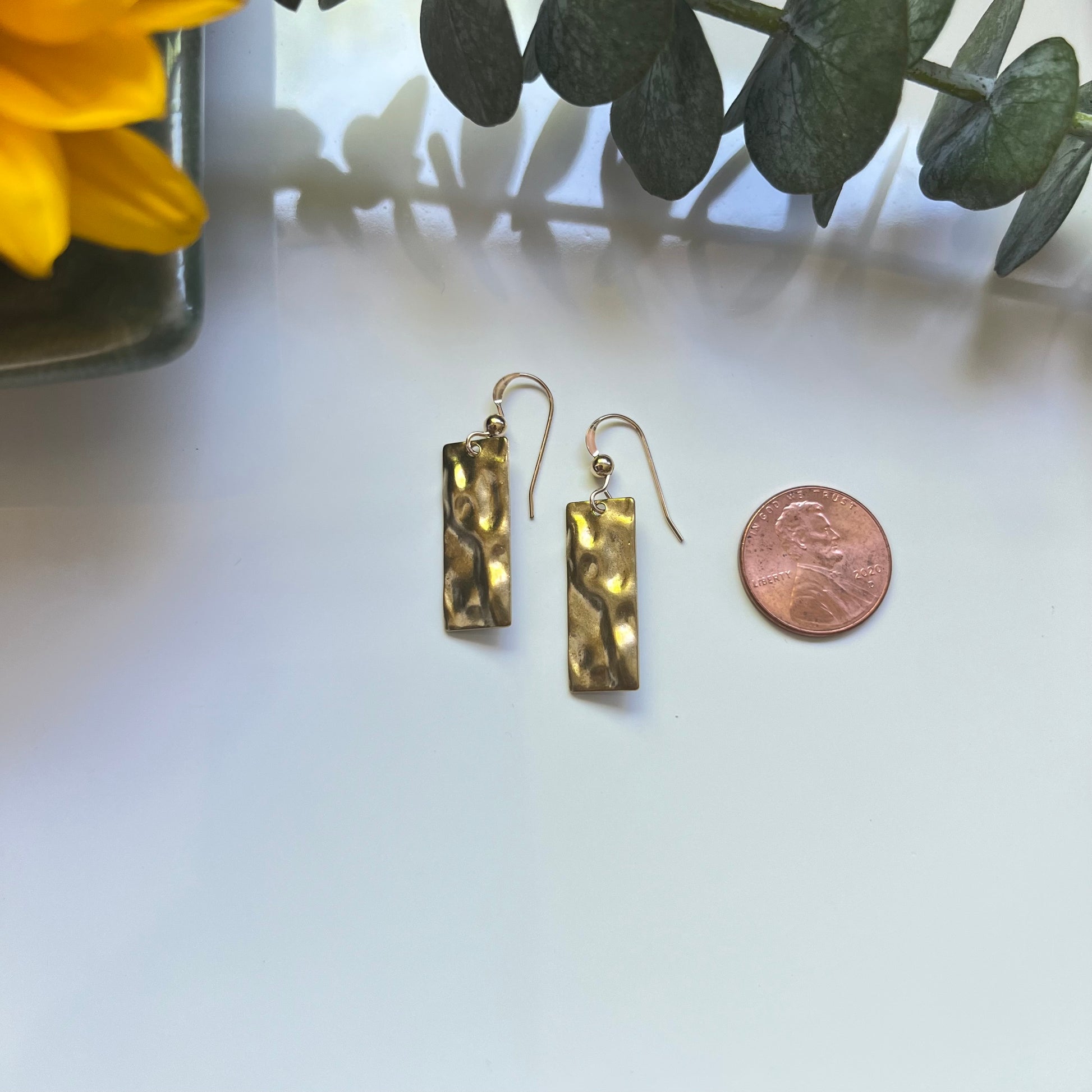 These dangly earrings feature hammered brass, 14k gold fill ear wires, and are lightweight for comfortable, all-day wear.