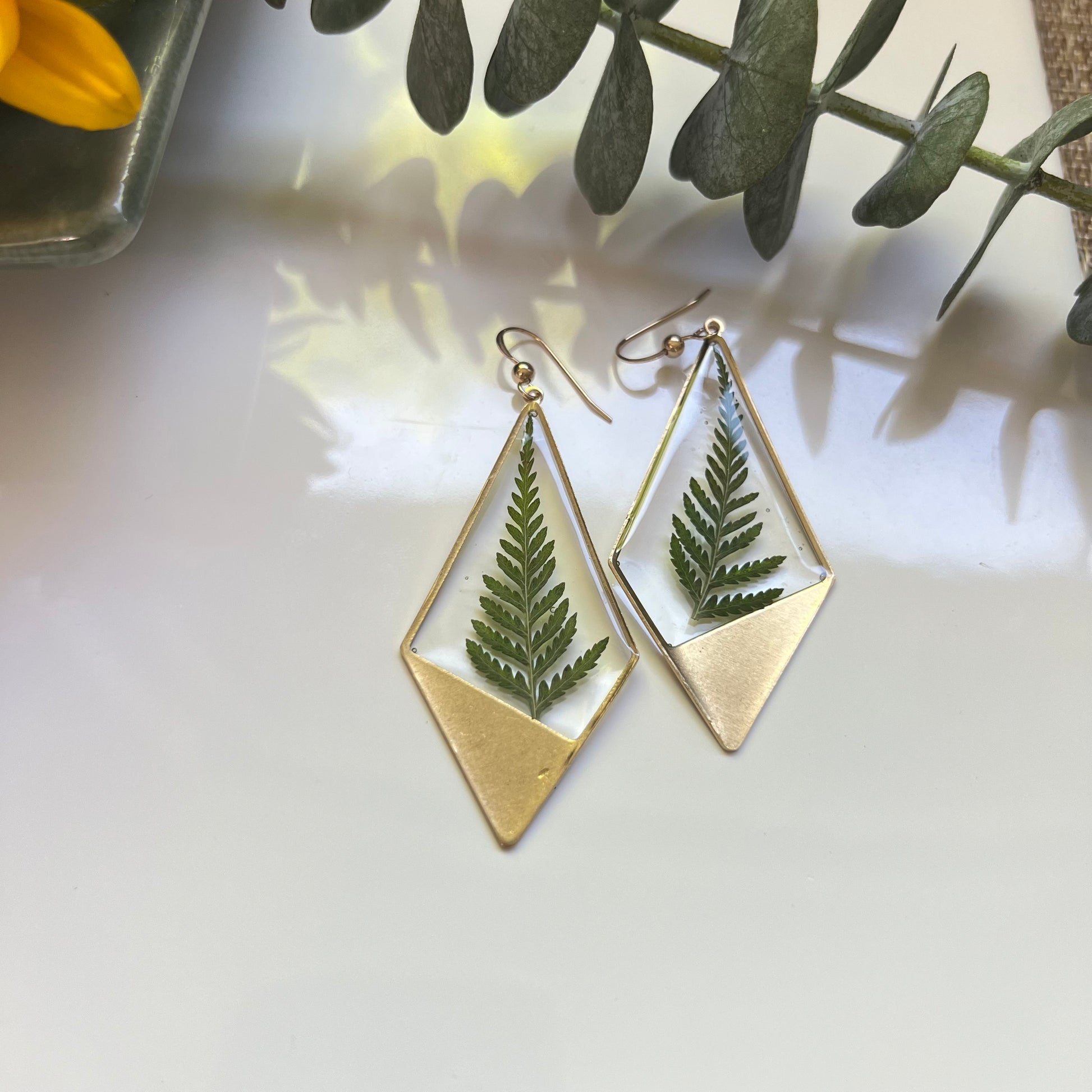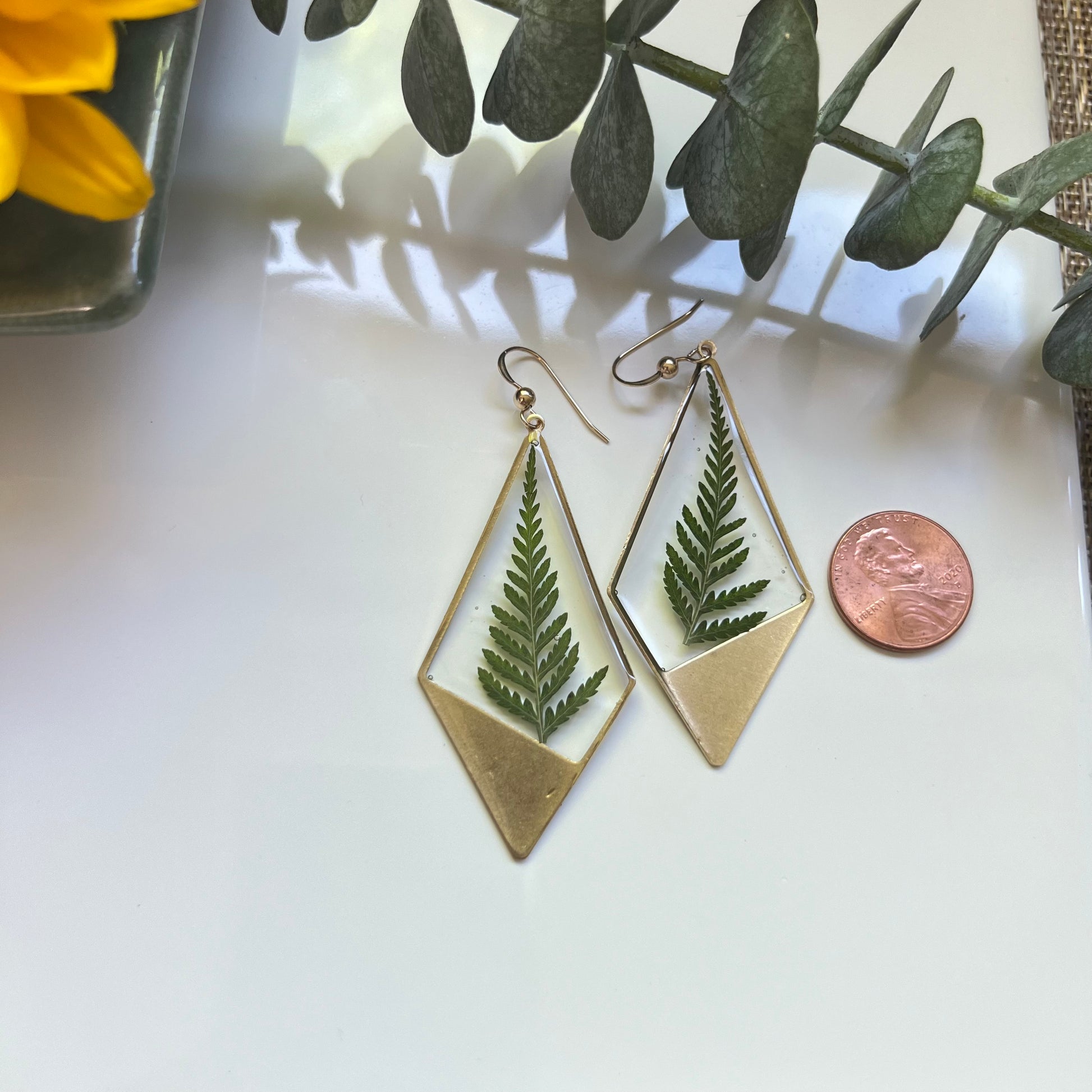 Crafted with real pressed ferns preserved in resin and held in a brass bezel with 14k gold fill ear wires.