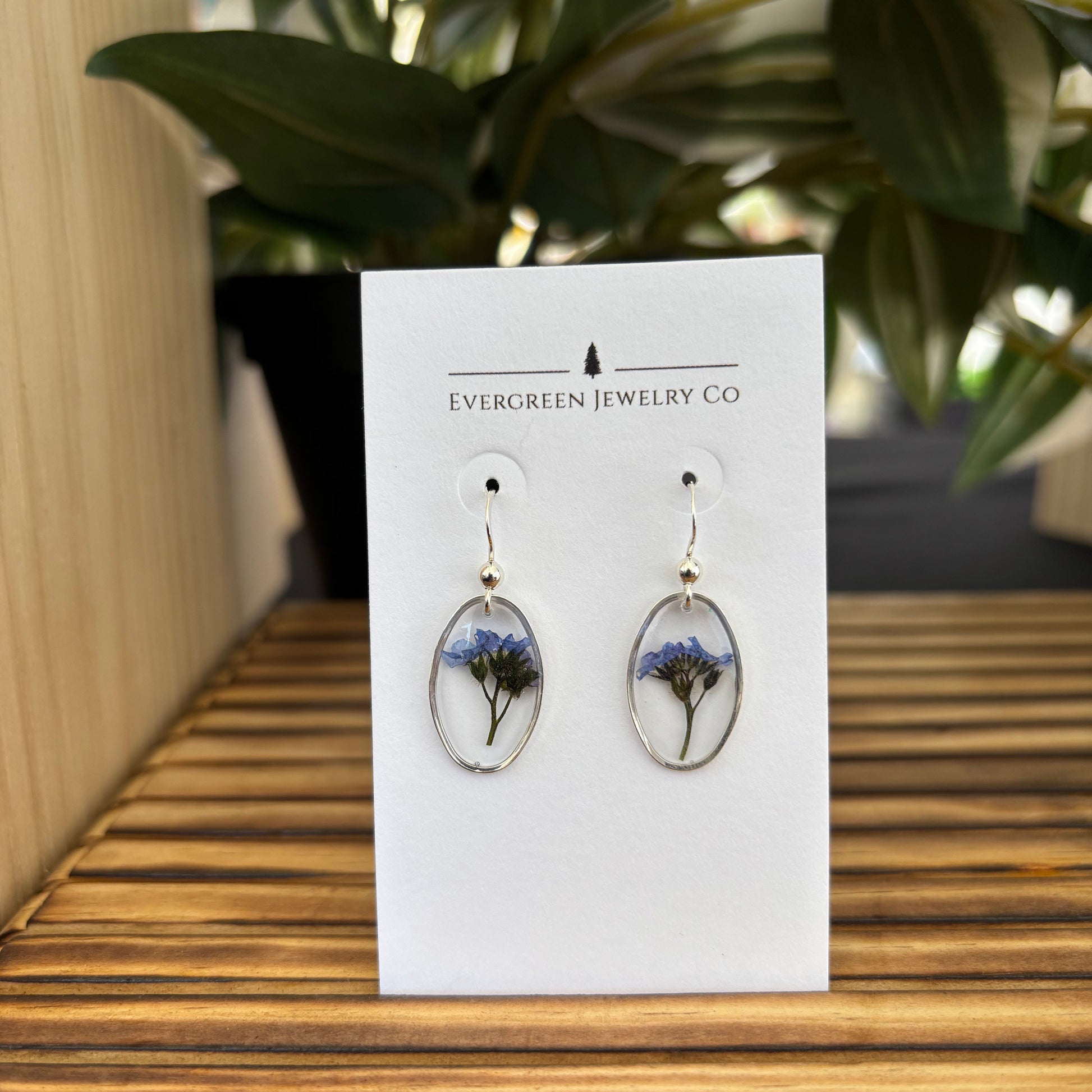 Crafted with pressed forget-me-not flowers and preserved in resin, hanging on sterling silver ear wires.