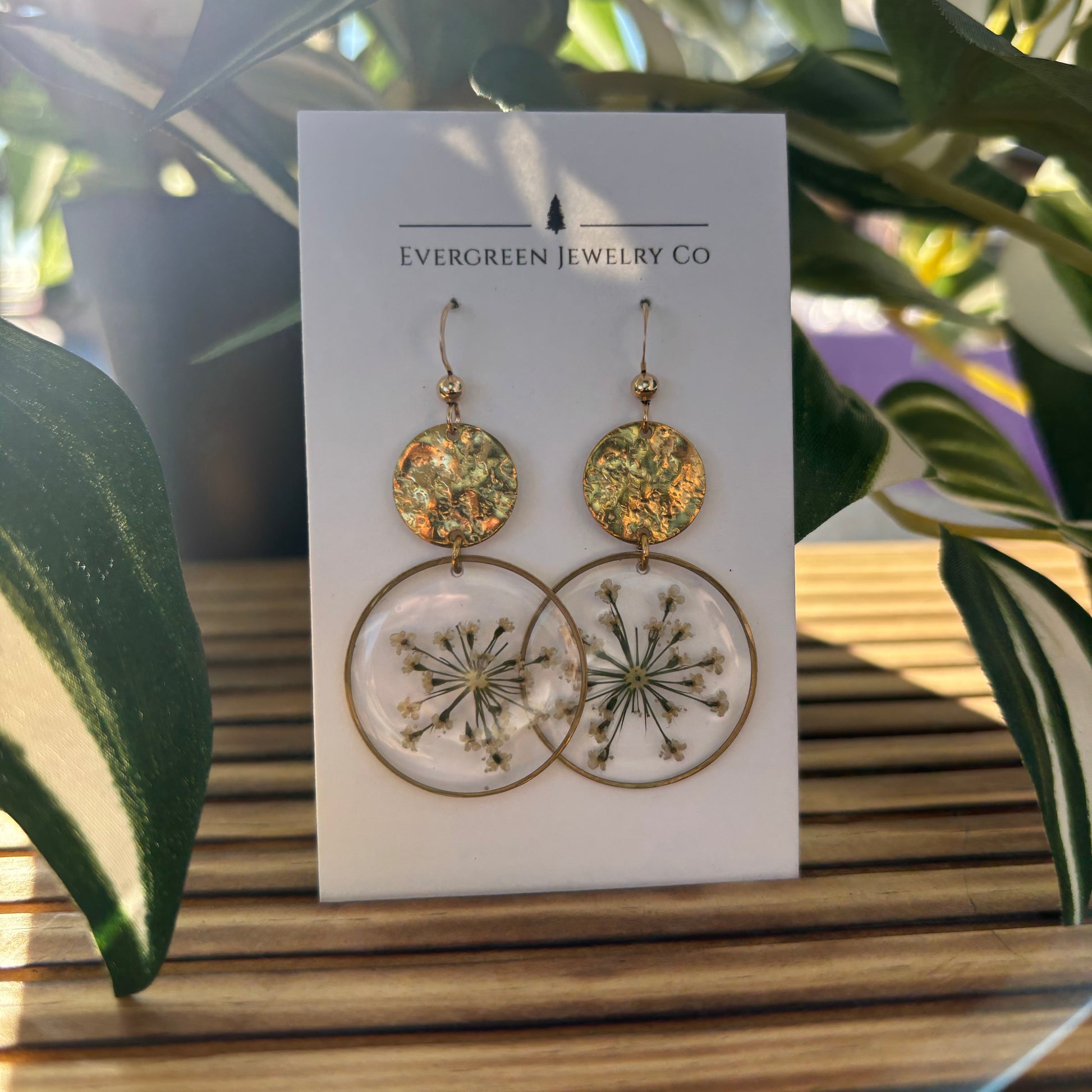 Crafted with pressed Queen Anne's lace, encased in clear resin and set in a brass bezel, hanging from a hammered brass coin. Made with hypoallergenic 14k gold fill ear wires.
