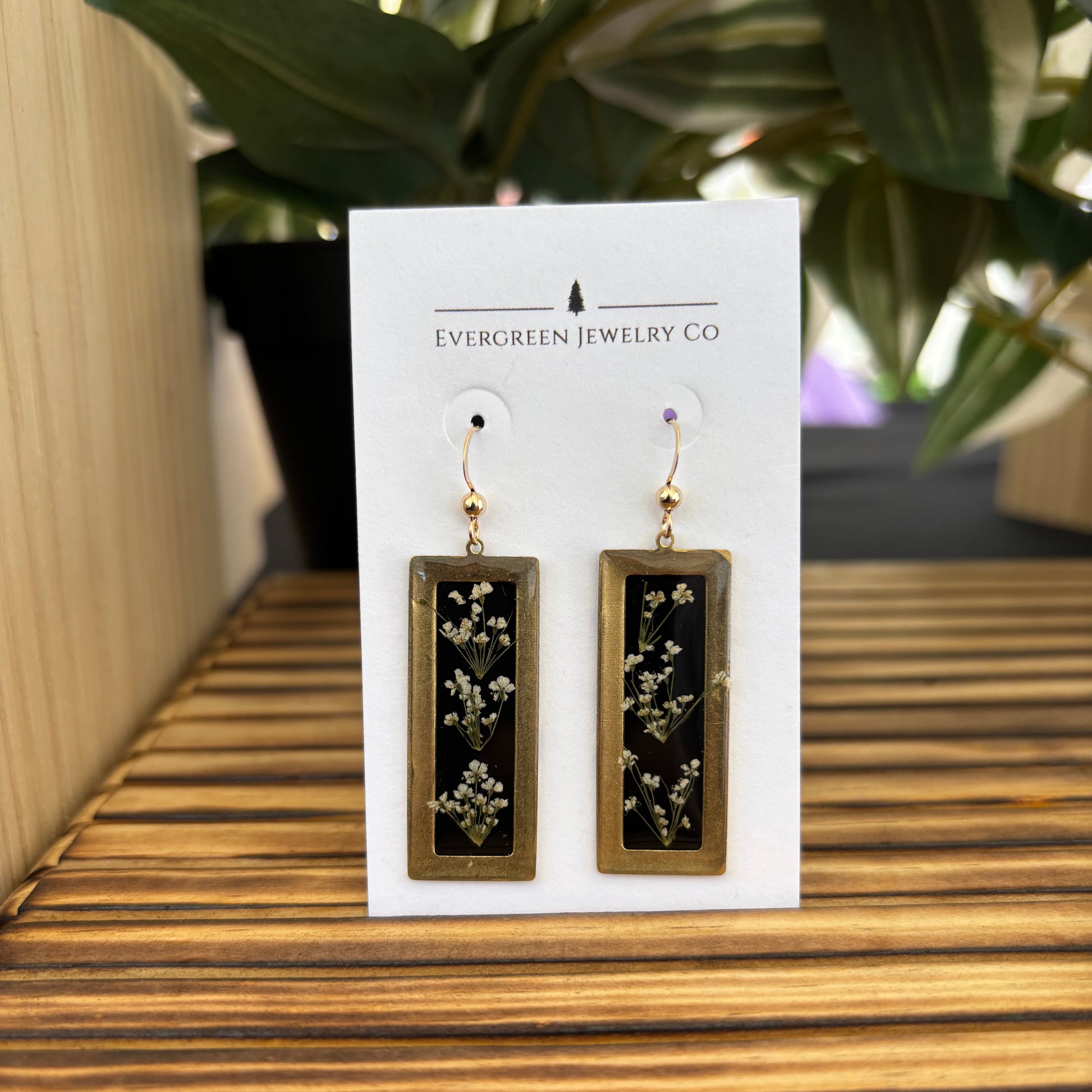 Crafted with pressed Queen Anne's lace flowers, encased in resin and set in a brass bezel. Made with hypoallergenic 14k gold fill ear wires.